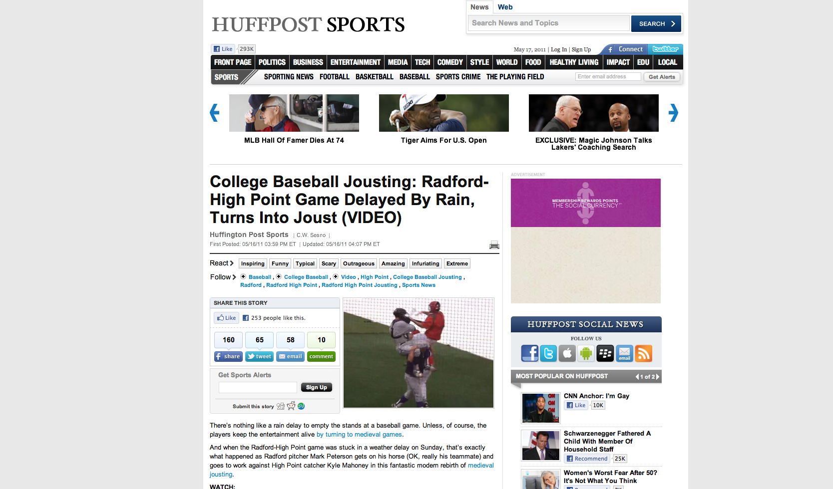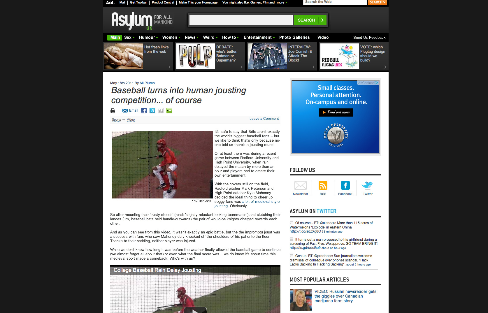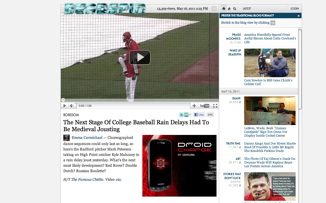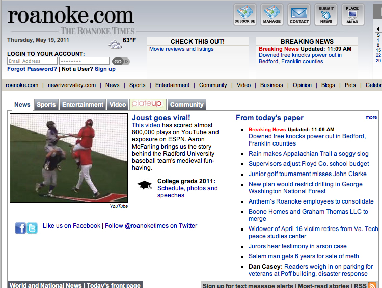 (Here’s his story, After turning medieval, Radford’s rain delay goes viral – May 19, 2011)
